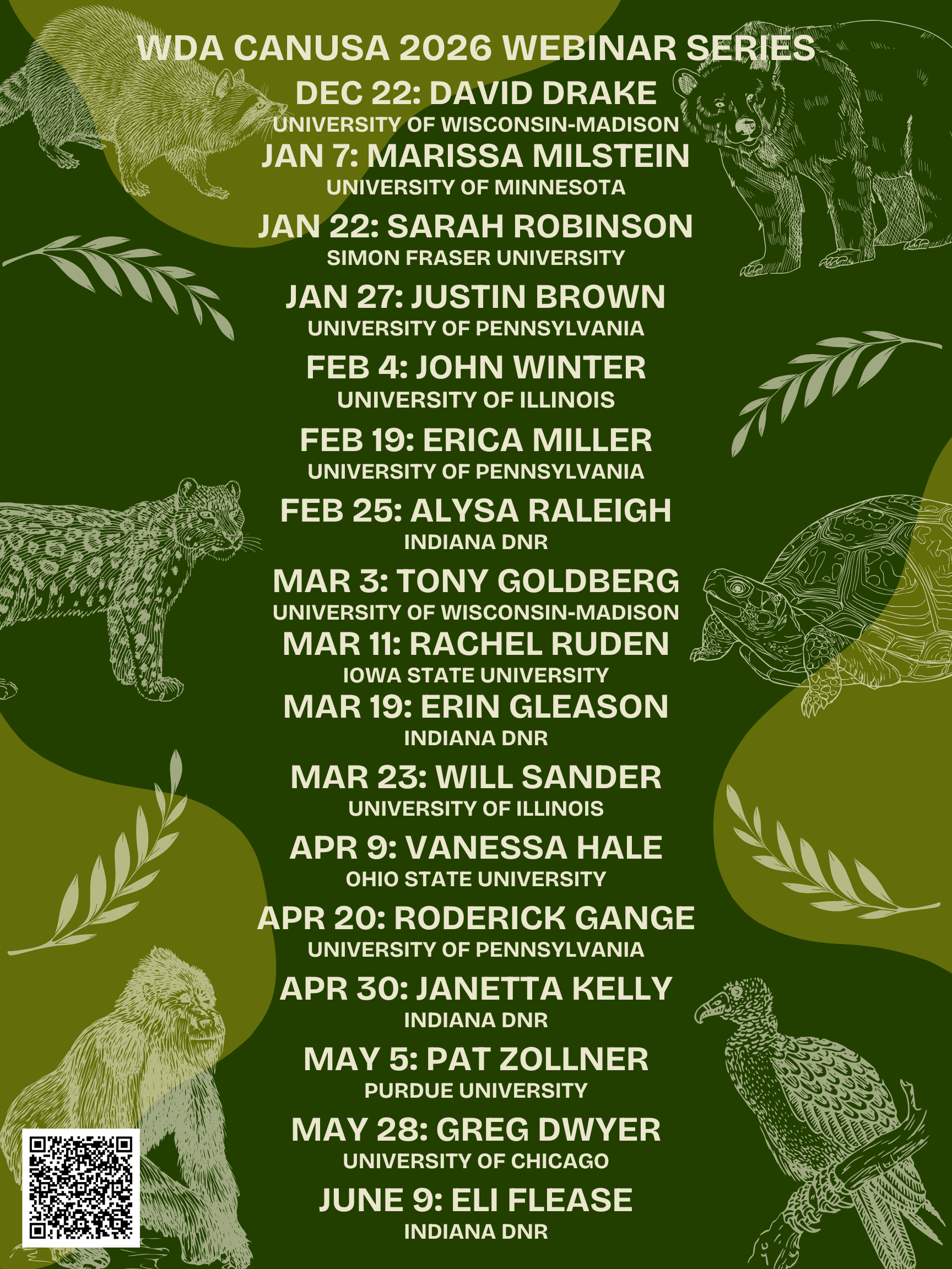 This exciting webinar series highlighting wildlife health in the Midwest and urban areas begins with Dr David Drake, a professor at the University of Wisconsin-Madison and wildlife specialist. His current projects include the Wisconsin elk project and the UW urban canid project. He studies environmental cues for migration in white-tailed deer and works to mitigate wildlife hazards to Wisconsin’s general aviation airports. He has also spearheaded wildlife initiatives in the Midwest.